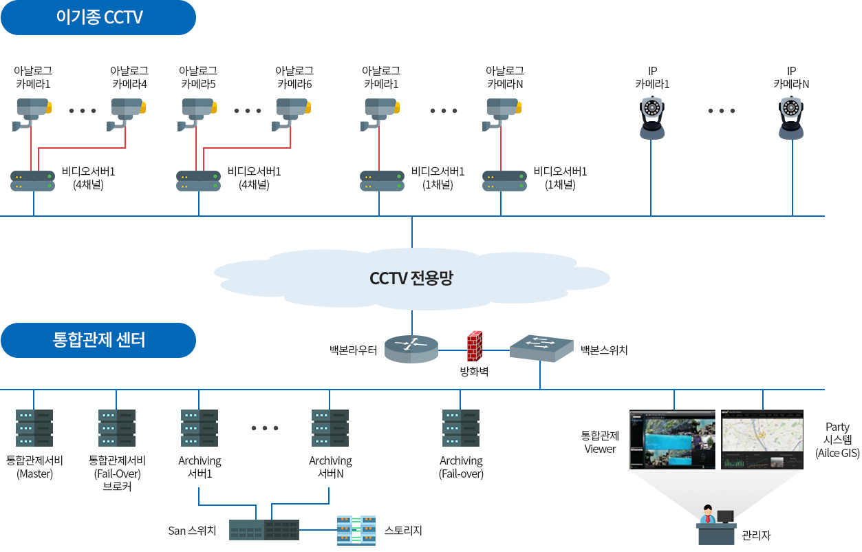 이기종 포맷의 다양한 비디오서버 및 IP 카메라를 수용할 수 있는 기본 플랫폼으로 구성되어 사용자 정보, 카메라 정보 및 보안을 위한 계정별 로그 및 업무이력을 저장하는 역할을 합니다.